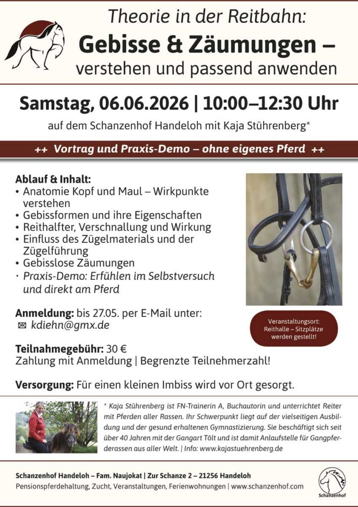 Diesmal geht es um Gebisse und Zäumungen in einem Vortrag, der Theorie, praktische Teile und kleine Demonstrationen am Pferd verbindet. Der Schanzenhof stellt hierfür seine Reithalle zur Verfügung und Sitzplätze.